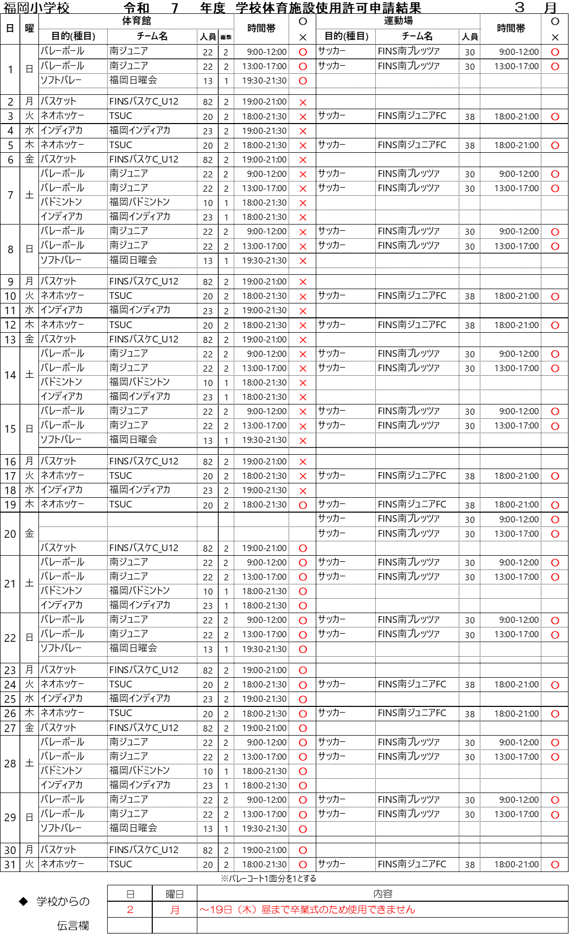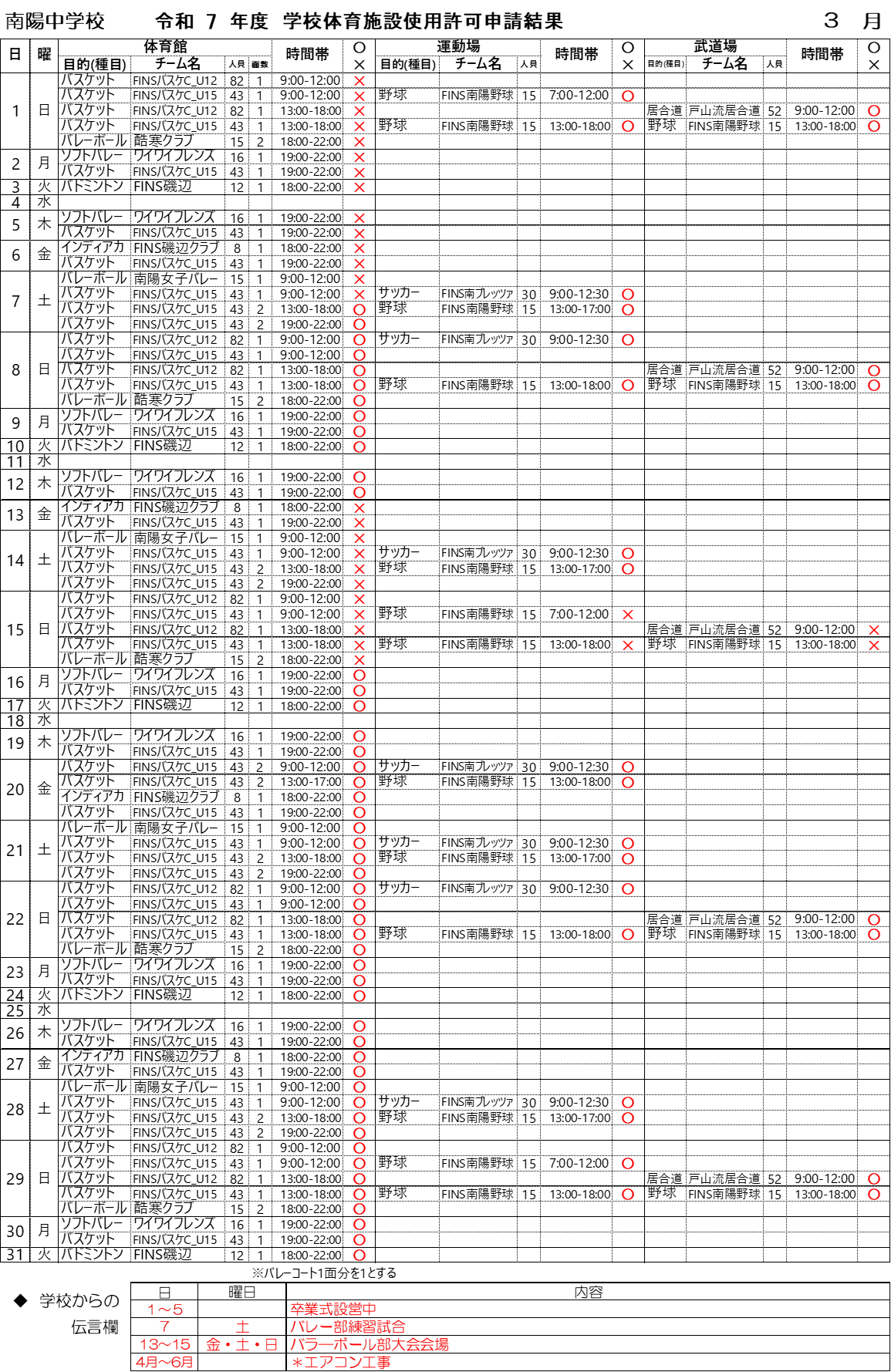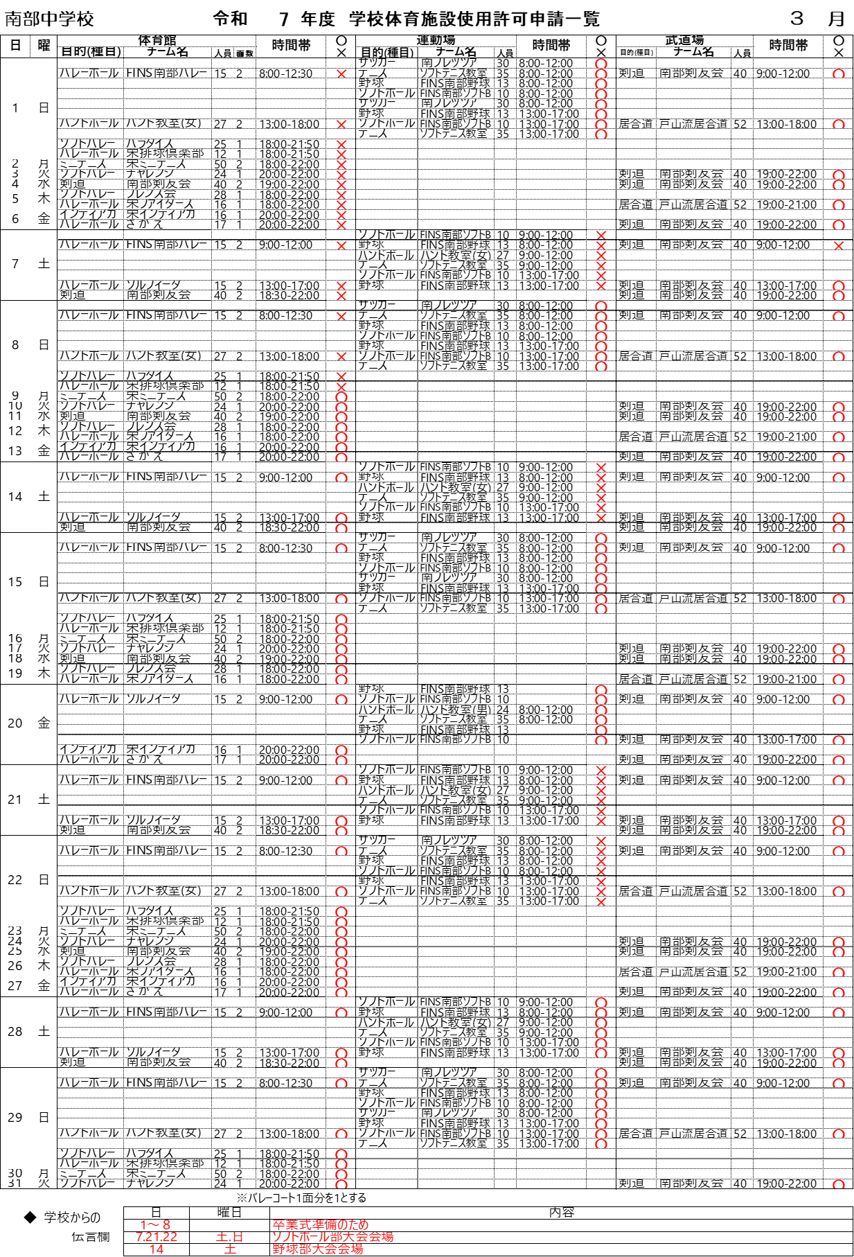 | 使用可能日 | 時間 | 施設 | 備考 |